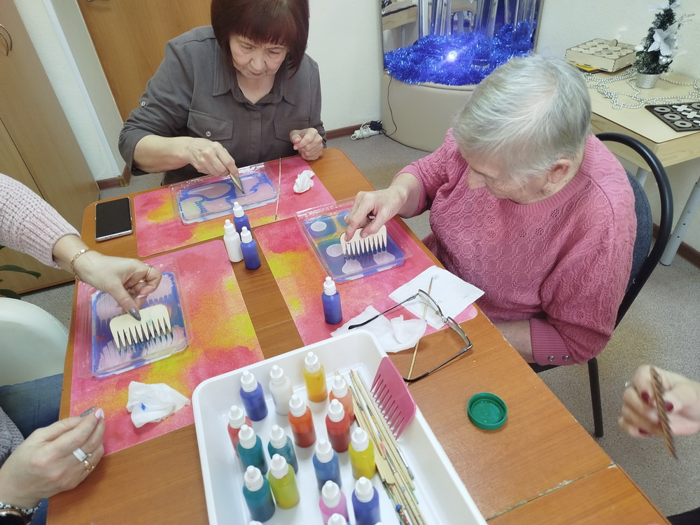 Морозным утром 14 января участники Проекта встретились в психологической студии «Гармония», чтобы познакомиться с новым видом художественного творчества «Рисование на воде красками Эбру». Это был первый опыт подобного творчества у всех участников занятия. Яркие краски, причудливые узоры, изящные линии, как по волшебству перенеслись на лист бумаги, вызвав восхищение у пожилых людей. Все работы получились уникальными и индивидуальными.