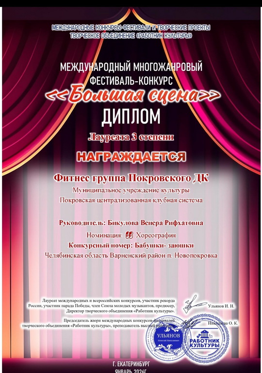 Покровский Дом культуры получил долгожданные дипломы, подтверждающие выдающиеся достижения участников художественной самодеятельности в международном многожанровом фестивале-конкурсе "Большая сцена"!