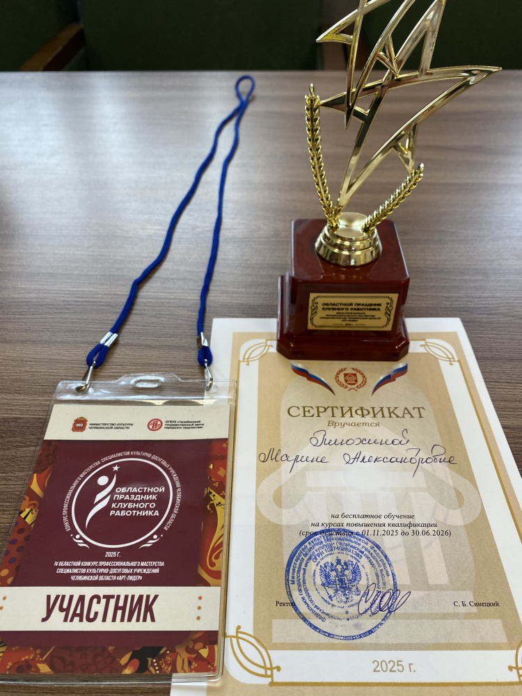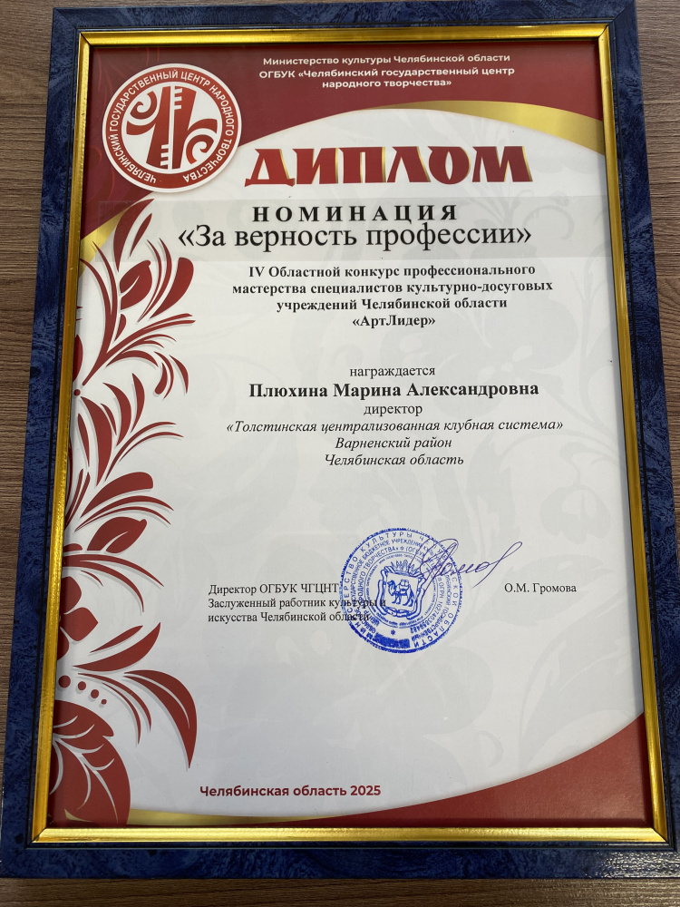 Варненский округ блестяще показал себя на областном конкурсе профессионального мастерства "Арт-лидер", благодаря директору МУК "Толстинская ЦКС" Марине Александровне Плюхиной. Её самоотверженность и профессионализм были отмечены дипломом "За верность профессии". Поздравляем с заслуженным признанием и желаем дальнейших успехов в творческой деятельности!