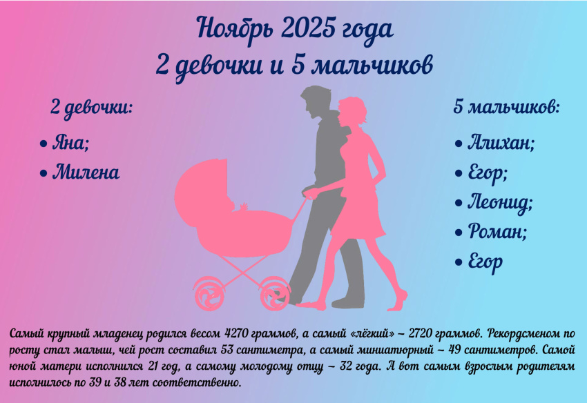 Самый крупный младенец родился весом 4270 граммов, а самый «лёгкий» — 2720 граммов. Рекордсменом по росту стал малыш, чей рост составил 53 сантиметра, а самый миниатюрный — 49 сантиметров. Самой юной матери исполнился 21 год, а самому молодому отцу — 32 года. А вот самым взрослым родителям исполнилось по 39 и 38 лет соответственно.