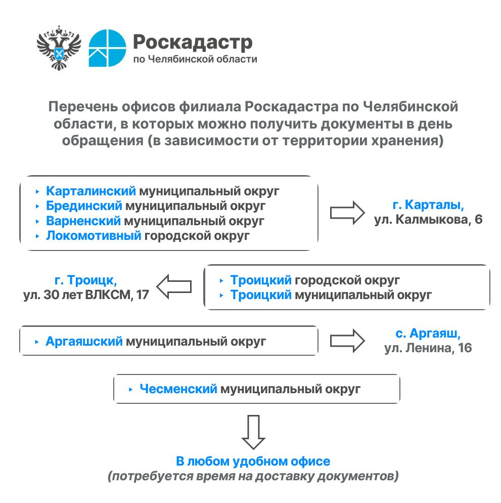 Важно! С января 2026 года офисы филиала Роскадастра в городах Усть-Катав и Верхний Уфалей прекратили работу. Теперь забрать невостребованные документы в день обращения жители Усть-Катава могут в Катав-Ивановске, а Верхнего Уфалея — в Кыштыме. Либо в любом удобном офисе, учитывая время на доставку бумаг.