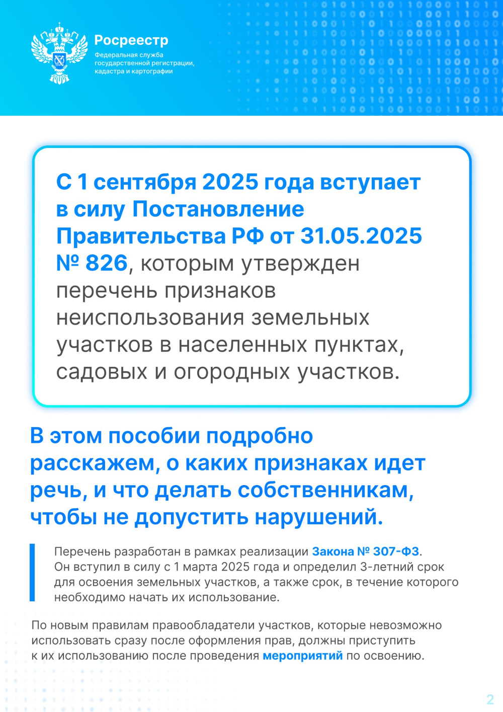 Росреестр разработал методическое пособие (https://rosreestr.gov.ru/upload/Doc/press/Признаки_неиспользования_земельных_участков.pdf) для граждан в связи с началом применения с 1 сентября 2025 года признаков неиспользования земельных участков в населённых пунктах, садовых и огородных участков. В нём в простой и доступной форме рассказывается, о каких признаках идёт речь и что делать собственникам, чтобы не допустить нарушений.