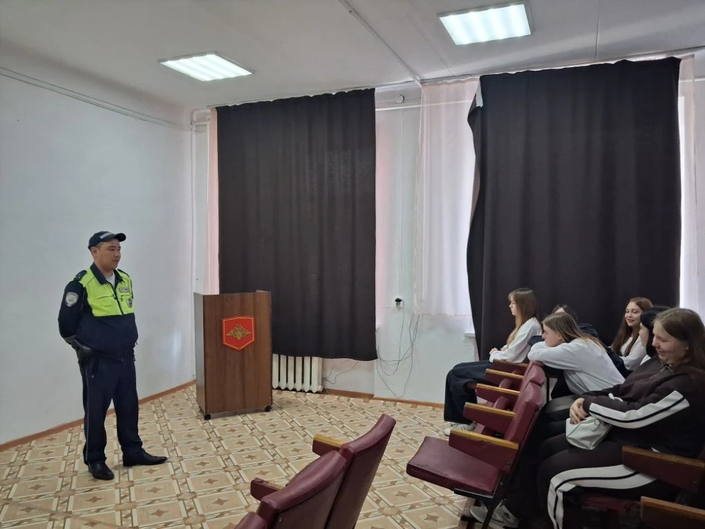 Встречу со студентами провёл старший инспектор ДПС отделения ГАИ ОМВД России по Варненскому району старший лейтенант полиции Кайрат Буканов.