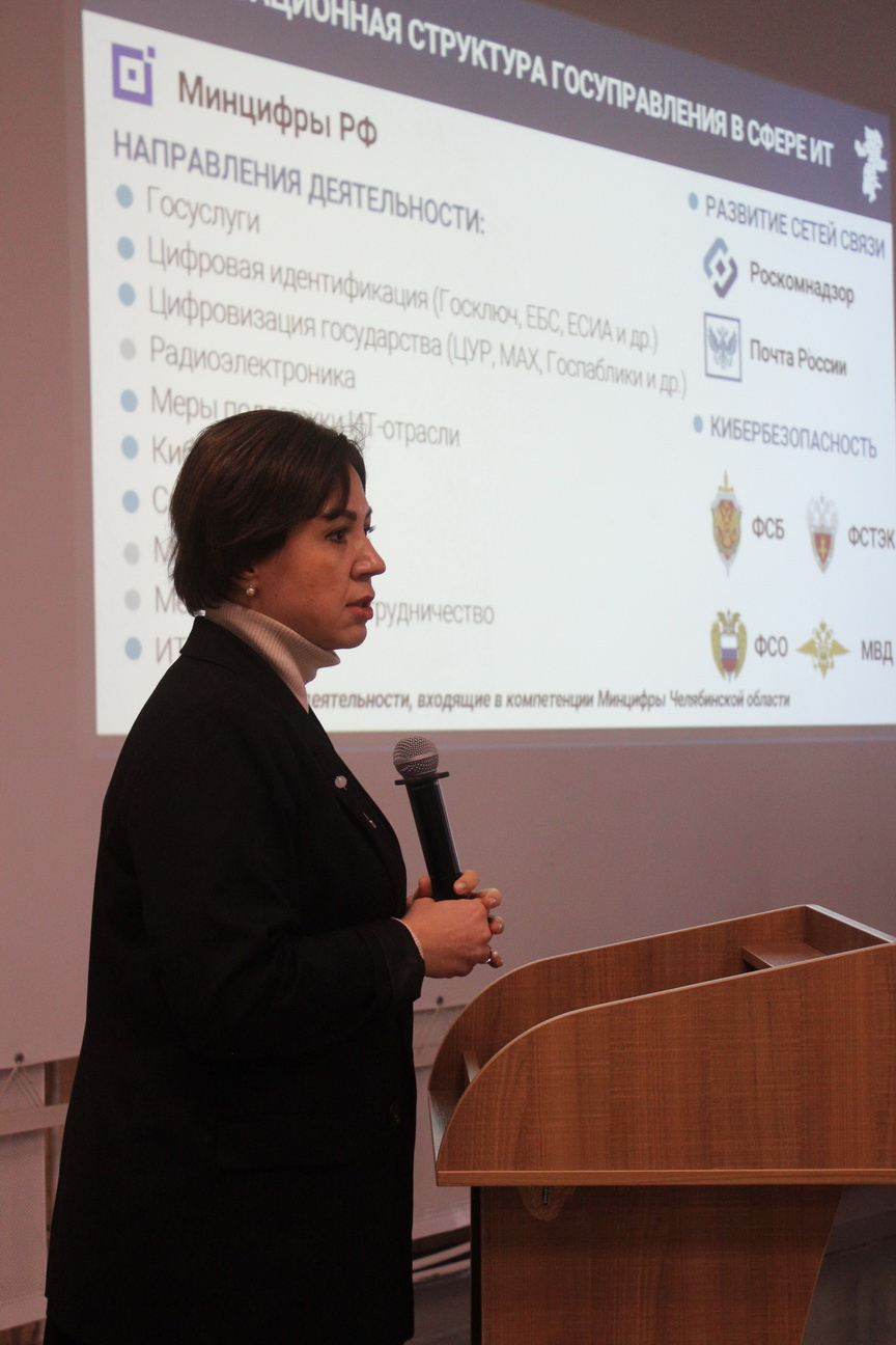 Перед участниками выступила заместитель Министра цифры Челябинской области Екатерина Давыдова. Она представила основные направления деятельности министерства и подведомственных учреждений: развитие телекоммуникаций, почтовой связи, ИТ-инфраструктуры региона, государственных информационных систем и сервисов, обеспечение информационной безопасности, внедрение Платформы обратной связи и национального мессенджера МАХ, поддержка ИТ-отрасли и подготовка ИТ-кадров.
