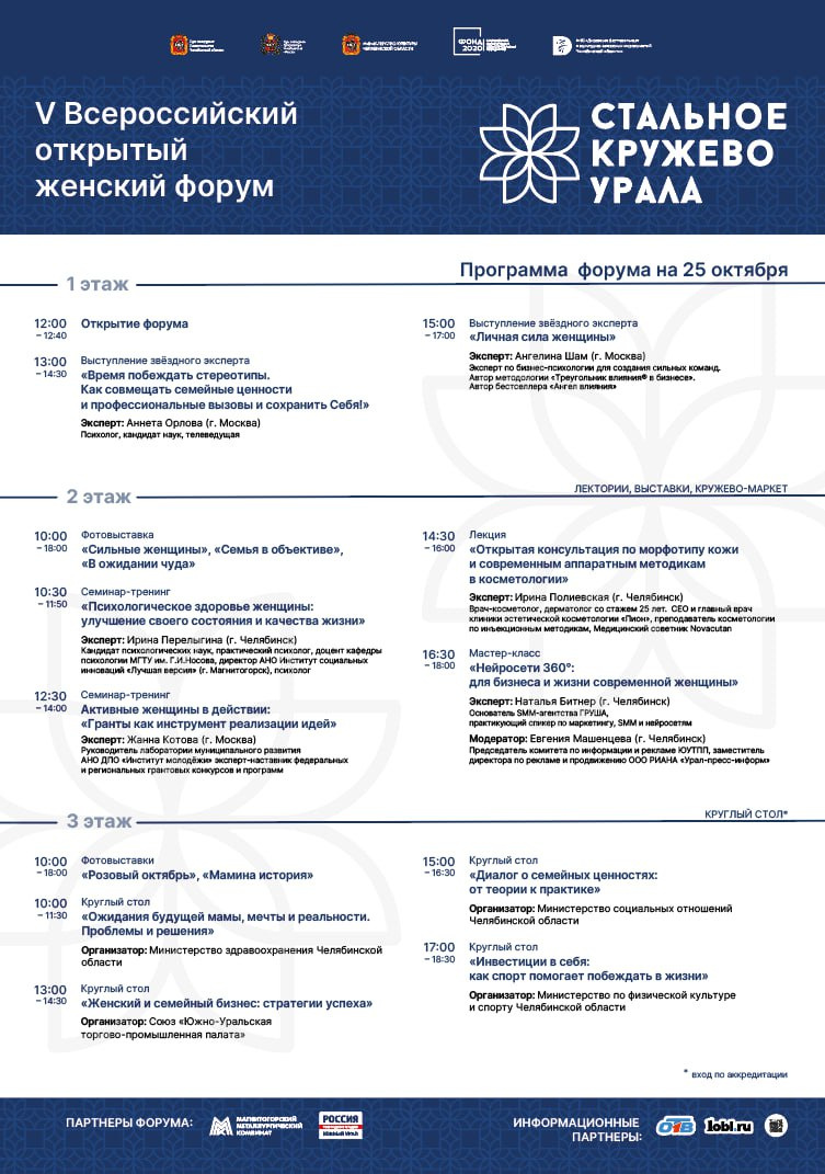 13:00–14:30 — Круглый стол. Тема: «Женский и семейный бизнес: стратегии успеха». Организатор: Союз «Южно-Уральская торгово-промышленная палата».