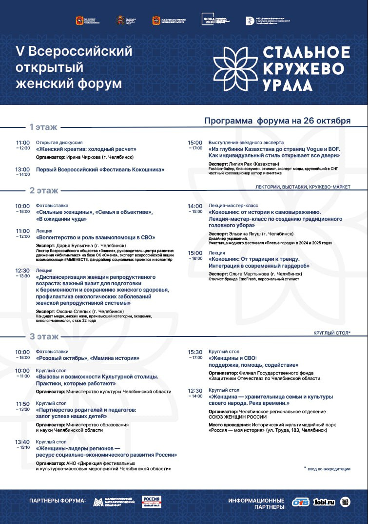 12:30–14:00 — Круглый стол. Тема: «Женщина — хранительница семьи и культуры своего народа. Река времени». Организатор: Челябинское региональное отделение Союза женщин России. Место проведения: Исторический мультимедийный парк «Россия — моя история» (ул. Труда, 183, Челябинск).