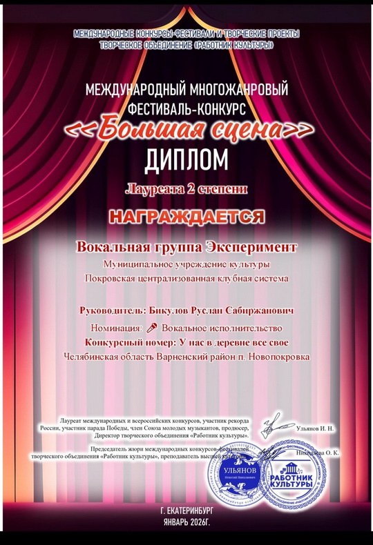 Покровский Дом культуры получил долгожданные дипломы, подтверждающие выдающиеся достижения участников художественной самодеятельности в международном многожанровом фестивале-конкурсе "Большая сцена"!