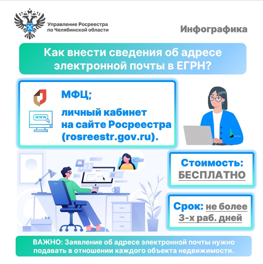 Почему собственнику недвижимости важно внести в Единый государственный реестр недвижимости актуальный адрес электронной почты и какие именно сведения о своём объекте он может оперативно узнать из сообщения на почту – читайте в информационных карточках Управления Росреестра по Челябинской области.