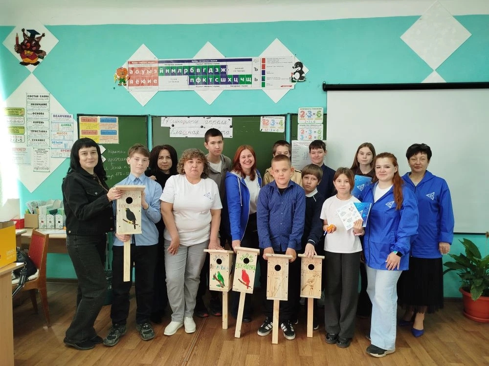 20 апреля 2026 года на базе МОУ СОШ п. Новый Урал для детей, состоящих на социальном сопровождении и постсопровождении в МУ «КЦСОН Варненского муниципального округа» и учащихся школы, сотрудники отделения помощи семье и детям совместно с волонтерами АО «Михеевский ГОК» провели мастер-класс по росписи скворечников.