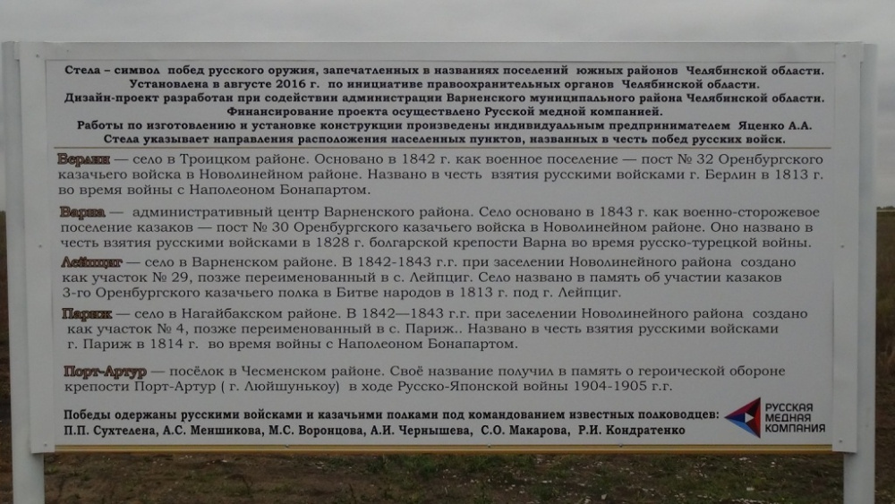 Данный объект установлен в 2016 году по инициативе правоохранительных органов Челябинской области. Дизайн-проект был разработан при содействии администрации Варненского района, финансирование проекта осуществляла Русская медная компания.