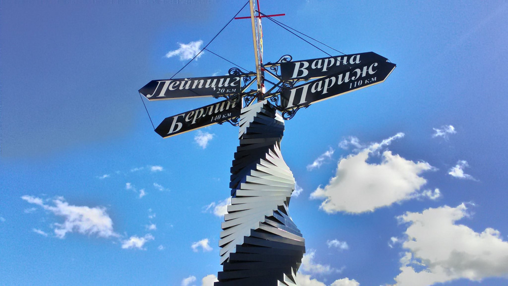 Стела представлена в виде верстового столба, символизирует тесную связь района с предприятием металлургической отрасли и указывает направления расположения населенных пунктов, названных в честь побед русских войск: Лейпциг, Берлин, Порт-Артур, Париж, Варна.