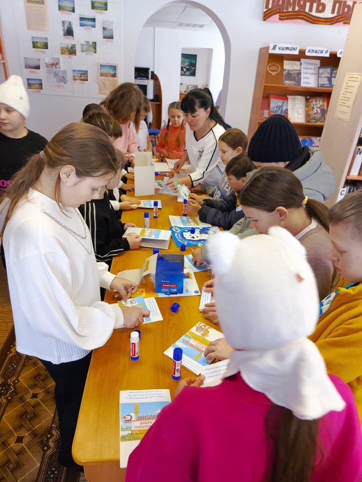 Кульминацией экскурсионной программы стало посещение библиотеки. Здесь знакомить ребят с николаевской станицей и местных достопримечательностях продолжила заведующая николаевской библиотекой Стародубцева Татьяна Анатольевна. Для того, чтобы каждый ребёнок смог увести с собой частичку этого дня был проведен мастер – класс по изготовлению 3D открытки с достопримечательностями села.