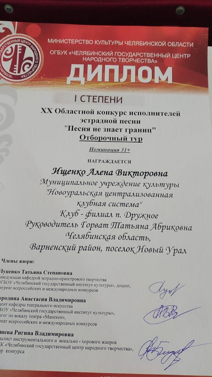 В ХХ областном отборочном конкурсе исполнителей эстрадной песни «Песня не знает границ» приняли участие талантливые жительницы п. Дружное. Алена Ищенко получила диплом 1 степени, а Татьяна Керницкая — диплом лауреата 2 степени