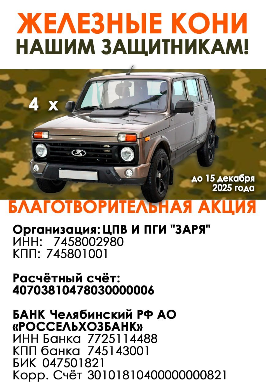 Нашим мужественным воинам нужны стальные кони — четыре автомобиля «Нива», которые станут надёжной опорой для доставки боеприпасов, провизии и эвакуации раненых. Каждая такая машина — это шанс спасти жизнь, это скорость помощи и уверенность в завтрашнем дне.