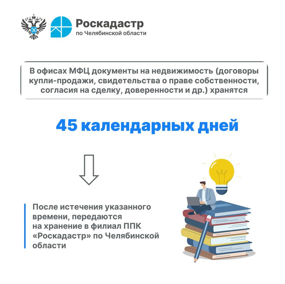 Документы хранятся в МФЦ не более 45 дней, после чего передаются в архив филиала «ППК» Роскадастр по Челябинской области. Получить их после этого можно в любом офисе регионального Роскадастра. Срок получения зависит от того, где осуществлялось первичное обращение за получением государственной услуги. Если бумаги хранятся в офисе, то их выдадут в день обращения. Если нет, понадобится время на их доставку до удобного для заявителя отделения. Также можно воспользоваться услугой курьера, что значительно сэкономит время.