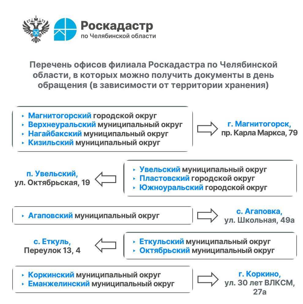 Важно! С января 2026 года офисы филиала Роскадастра в городах Усть-Катав и Верхний Уфалей прекратили работу. Теперь забрать невостребованные документы в день обращения жители Усть-Катава могут в Катав-Ивановске, а Верхнего Уфалея — в Кыштыме. Либо в любом удобном офисе, учитывая время на доставку бумаг.