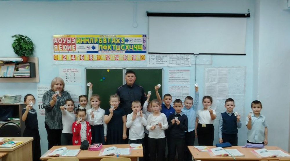 В заключении встречи каждому первокласснику вручили светоотражающий элемент, который поможет маленькому участнику дорожного движения быть заметней на дороге и обезопасит его движения.
