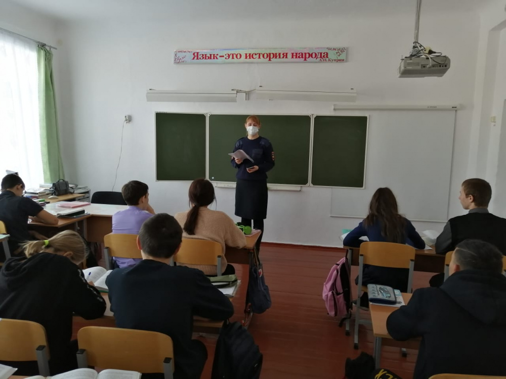 Инспектор ПДН ОМВД России по Варненскому району лейтенант полиции Татьяна Проховская провела беседу с учащимися 7-8 классов МОУ СОШ п. Новопокровка о правилах и нормах безопасного поведения дома, на улице и на дороге, а также довела информацию об ответственности несовершеннолетних в случае совершения противоправных деяний.