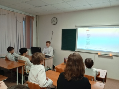 Весь рассказ подтверждался фотографиями и презентацией. В ходе встречи была проведена небольшая викторина по теме урока мужества. Завершилось мероприятие минутой молчания в память о погибших героях. В конце ученик 7а класса Зотов Семен прочитал стихотворение собственного сочинения о своем прапрадедушке, участнике ВОВ.